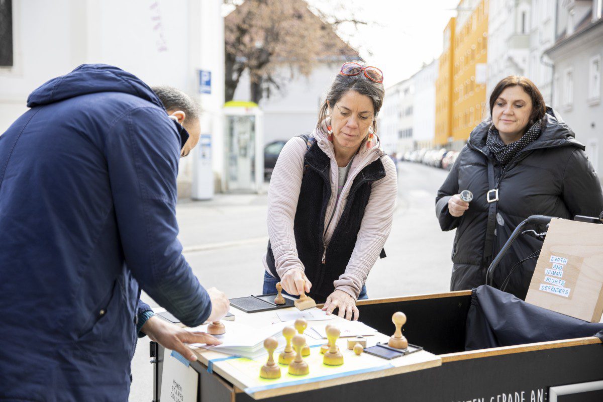 The collection has been exhibited in the feminist archive in < rotor > centre for contemporary art, where visitors could make badgets with them. For the Human Rights Day celebration in the Afro-asiatisches Institut in Graz, the collection was presented together with the critical map “Who Owns the Land?” of the collective iconoclasistas, free to download here.
