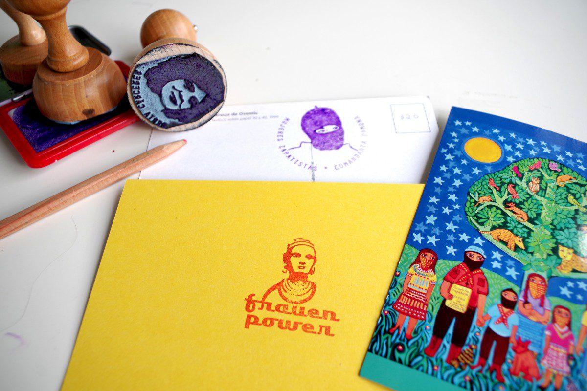 The collection is normally presented in the format of the Empowerment Print Bar in street actions, where people can stamp postcards, small notebooks, badges available for free, or in any surface they feel like.
